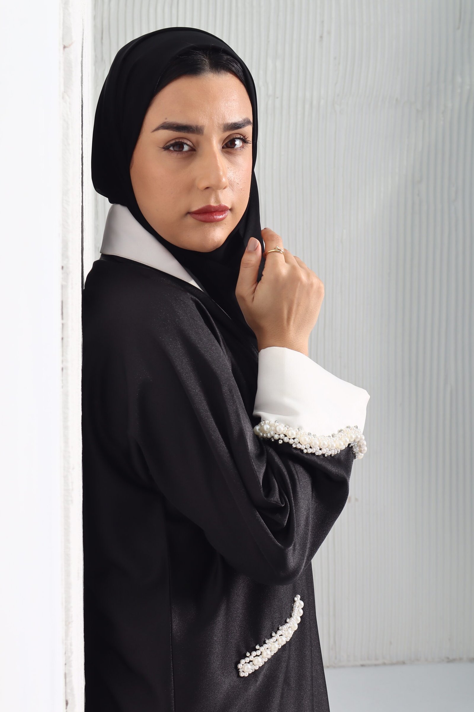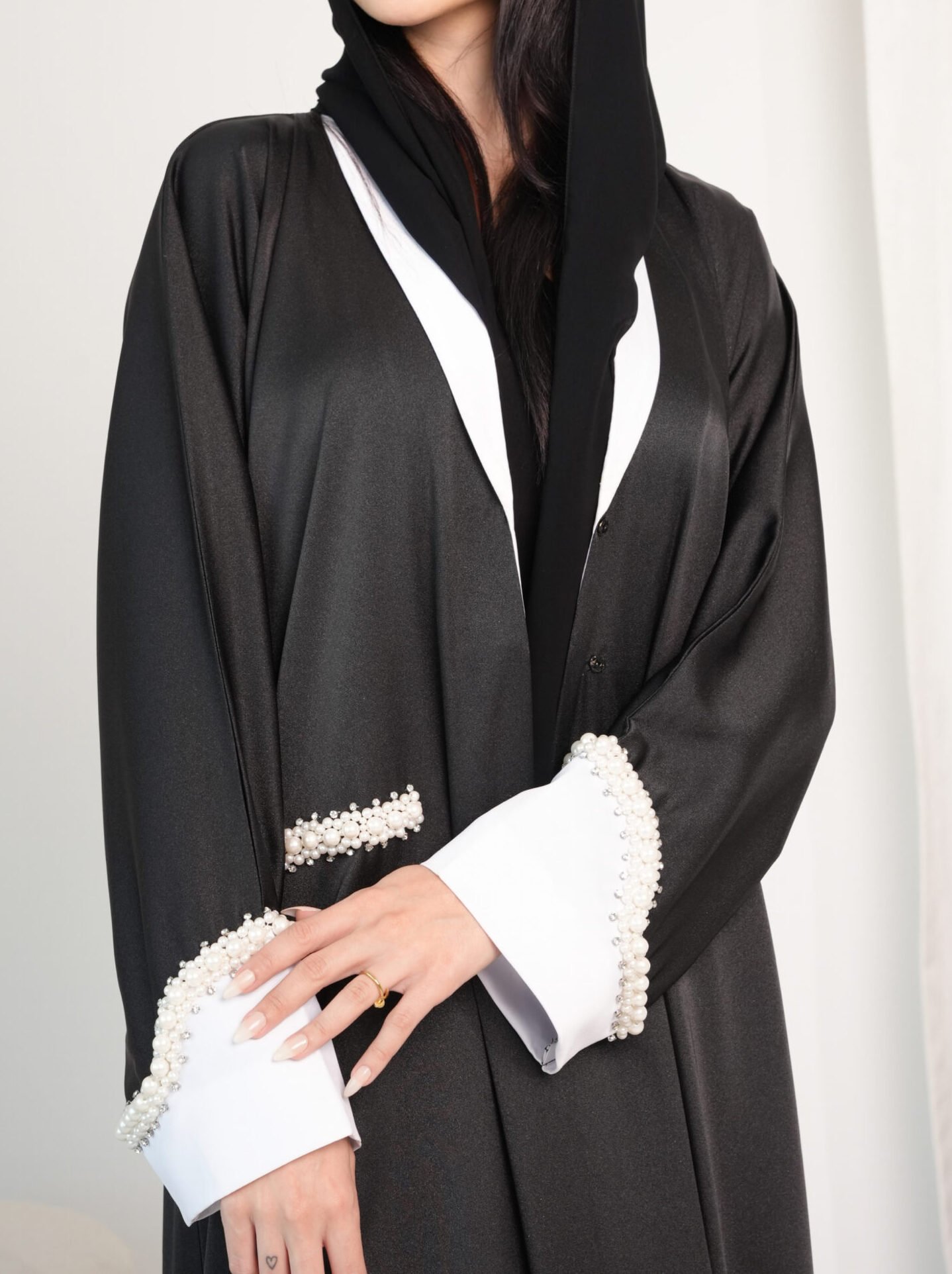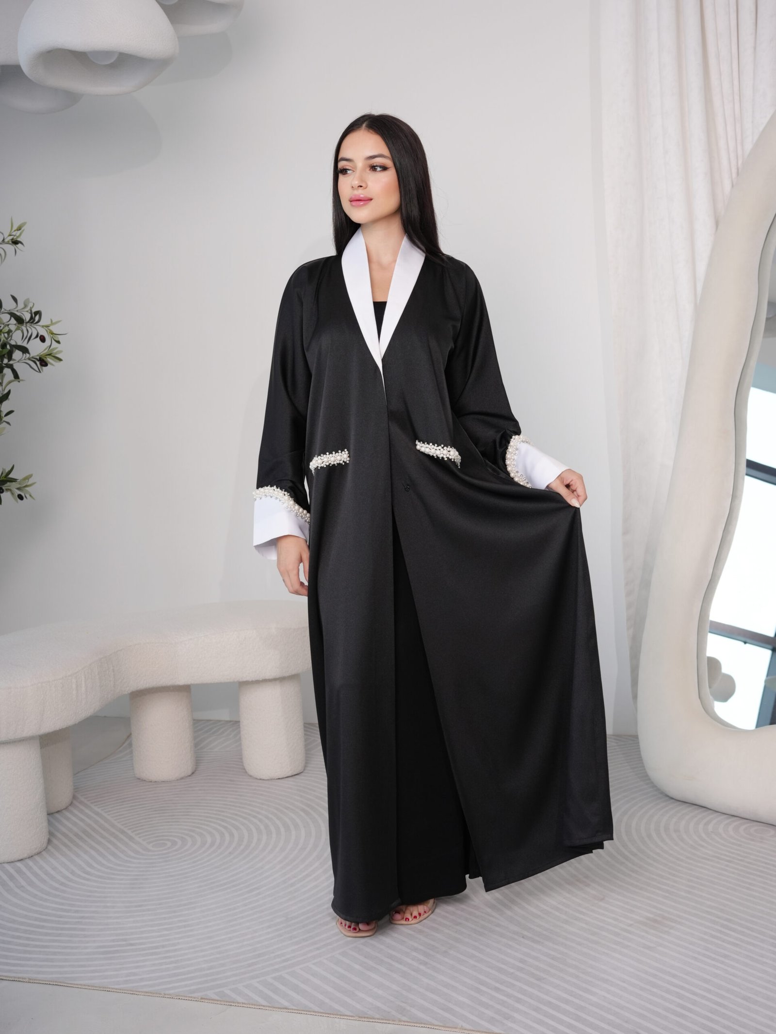 عباية مزينة باللؤلؤ قماش الكريب الناعم وياقة ساتان